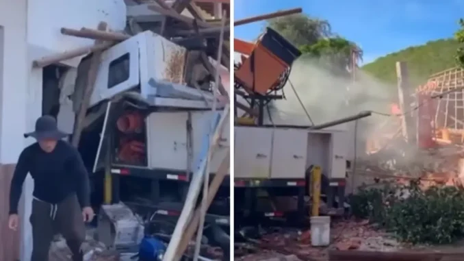 Um vídeo de câmera de segurança mostra o momento exato em que o caminhão desce desgovernado e atinge tudo o que encontra pela frente. As imagens mostram violência do impacto e a dimensão do acidente.